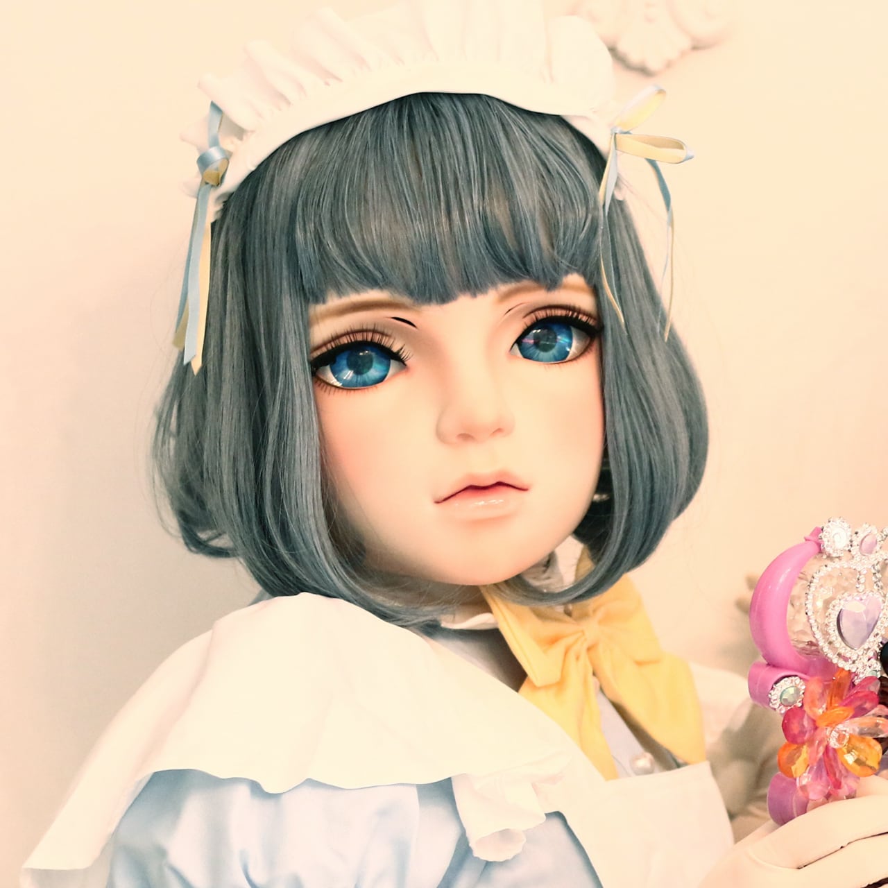 A doll mask featuring volume lips and rounded face lines