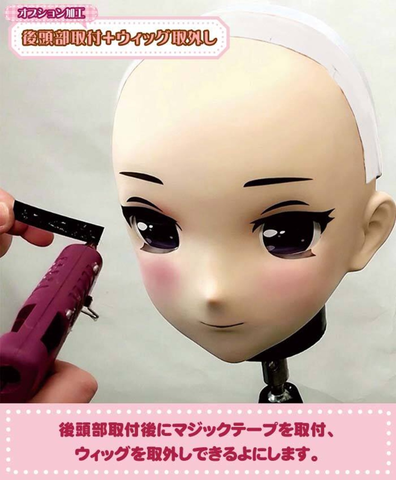 Requires attachment of rear head cover and wig