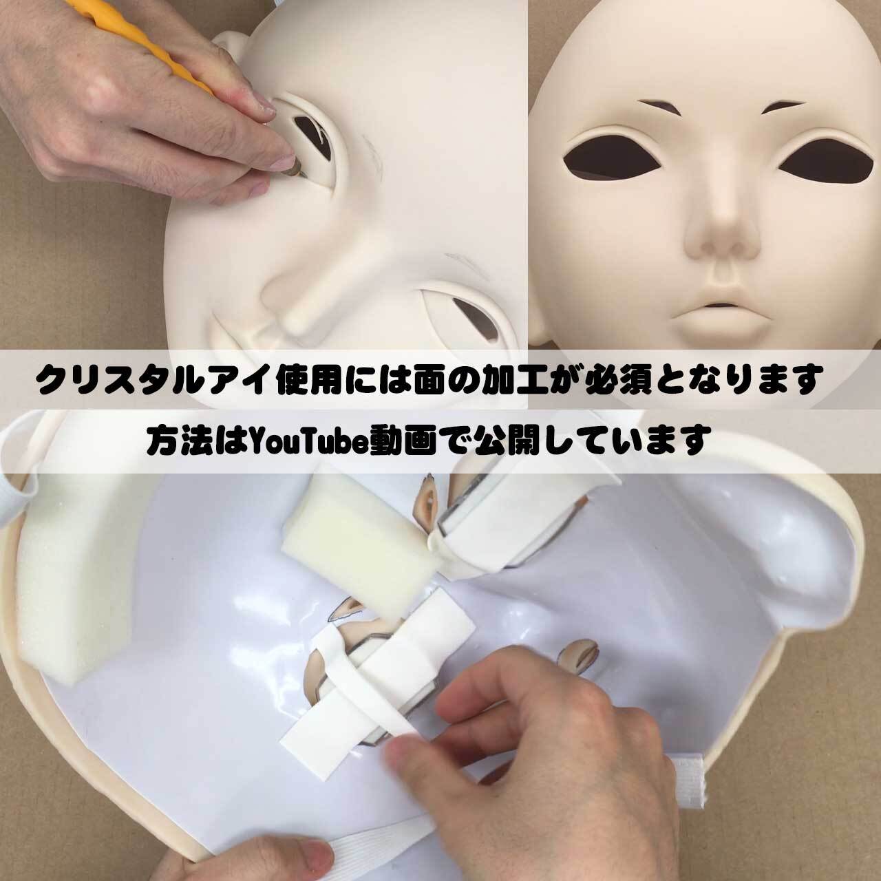 マスクの裏側からクリスタルアイを嵌めると、生き生きとした輝く瞳を表現することができます。